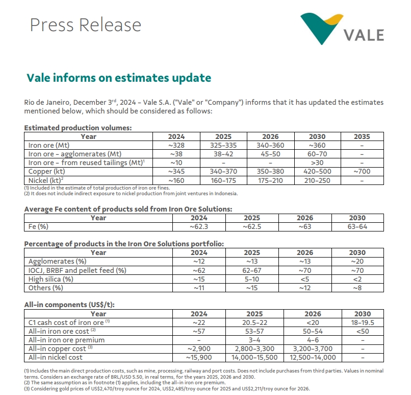 當(dāng)?shù)貢r(shí)間12月3日,淡水河谷發(fā)布公告稱,預(yù)計(jì)2024年鐵礦石產(chǎn)量約為3.28億噸,2025年為3.25-3.35億噸,2026年為3.4-3.6億噸,2030年約為3.6億噸。