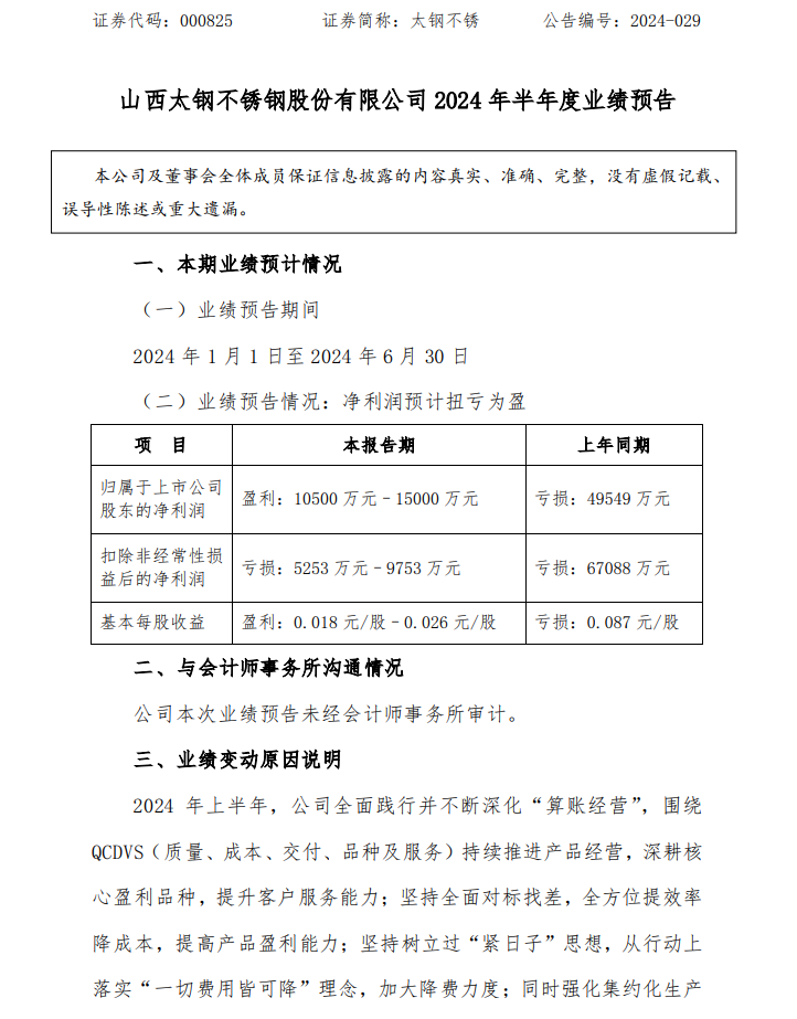 太鋼不銹(000825)7月9日晚間披露業(yè)績預(yù)告,預(yù)計(jì)2024年上半年歸母凈利潤1.05億元至1.5億元,上年同期虧損4.95億元;扣非凈利潤虧損5253萬元至9753萬元,上年同期虧損6.71億元;基本每股收益0.018元/股-0.026元/股。