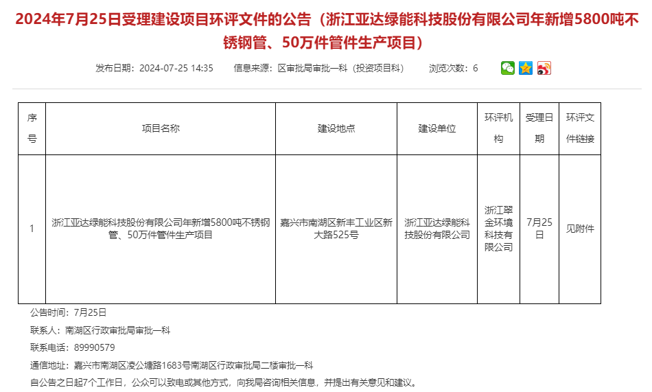 7月25日,浙江亞達(dá)綠能科技股份有限公司年新增5800噸不銹鋼管、50萬件管件生產(chǎn)項(xiàng)目環(huán)評(píng)文件獲受理,公告期:7個(gè)工作日。