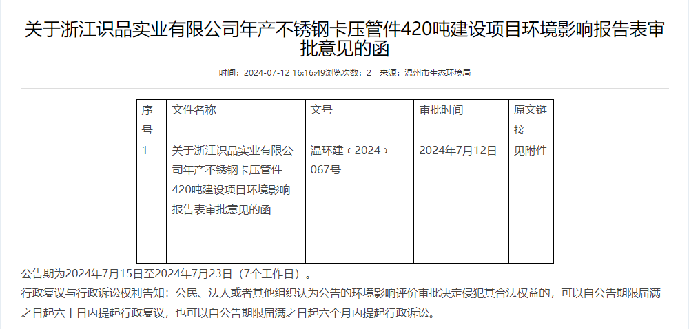 7月12日,溫州市生態(tài)環(huán)境局就浙江識品實業(yè)有限公司年產(chǎn)420噸不銹鋼卡壓管件建設項目環(huán)境影響報告表作出審批意見并對外進行公告,公告期為2024年7月15日至2024年7月23日(7個工作日)。