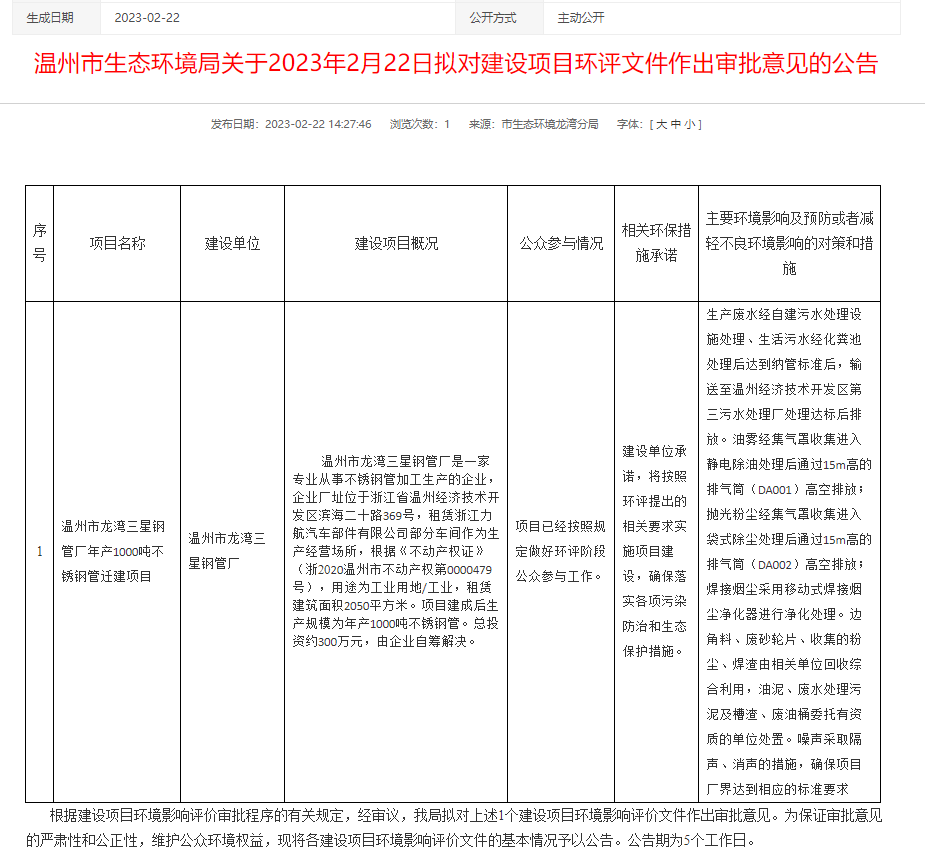 2月21日,溫州市生態(tài)環(huán)境局龍灣分局就溫州市龍灣三星鋼管廠年產(chǎn)1000噸不銹鋼管遷建項目環(huán)境影響評價報告表作出審批意見并對外進(jìn)行公告,公告期:5個工作日。